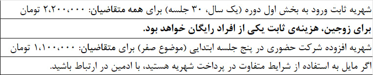 شهریه ثابت شرکت در سال اول دوره (30 جلسه) مبلغ 2,200,000 تومان است. (شهریه ثابت زوجین، یک نفر حساب خواهد شد؛ شرکت حضوری هزینه افزوده خواهد داشت)